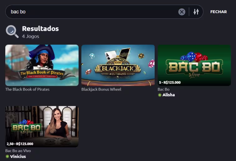 Note que tivemos dois resultados referentes ao Bac Bo, e você pode escolher qualquer um deles. Em um, a aposta mínima é de R$2,50, e em outro a aposta mínima é de R$5. Escolha aquele que que você prefere, e vamos começar a jogar Bac Bo na Betano!