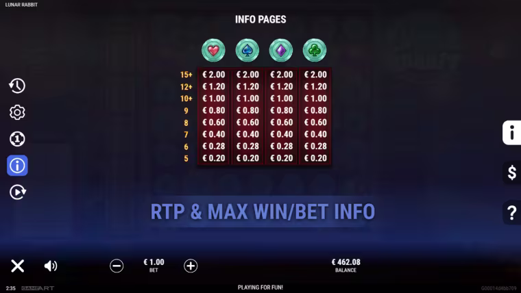 Desenvolvido pela Gameart em 2023, o Lunar Rabbit apresenta um RTP de 96,59% e uma volatilidade considerada alta.